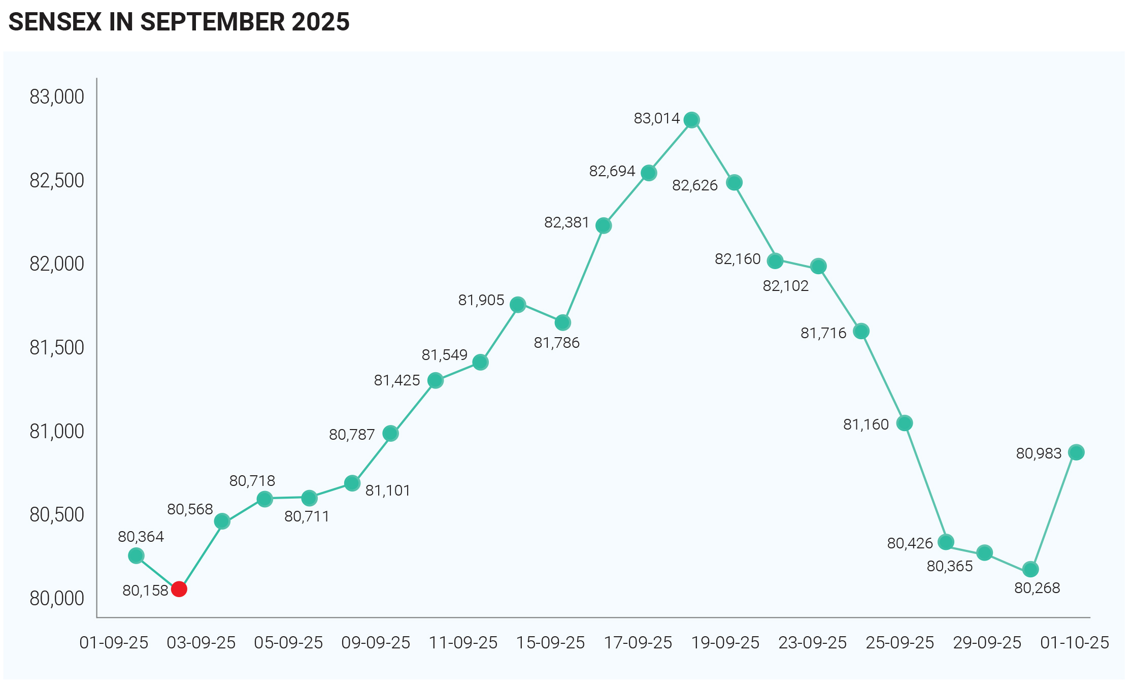 At the beginning of September, investor sentiment appeared upbeat. Both Sensex and Nifty climbed toward near-record highs, with the Sensex hovering between 80,300 and 81,900, while the Nifty traded between 24,700 and slightly above 25,100. This early rally was largely underpinned by optimism surrounding positive macroeconomic data, upbeat earnings expectations, and hopes of pro-growth policy reforms. However, this upward momentum failed to sustain itself as the month progressed, with the market losing steam in the latter half. Sectoral underperformance—particularly in IT, auto, and consumer-facing segments—combined with global uncertainty, led to a loss of gains and a shift in investor tone from bullish to defensive. By month-end, the Sensex and Nifty had posted monthly returns in the narrow range of 0.6% to 1.5%, highlighting the lack of decisive directional movement. Several factors contributed to this subdued performance. On the global front, ongoing trade tensions between the United States and India weighed heavily on sentiment. The imposition of 50% tariffs by the US on key Indian exports, including automobiles, textiles, and pharmaceuticals, sparked concerns over India’s export competitiveness and pressured related sectors. Simultaneously, continued uncertainty surrounding H-1B visa reforms in the US negatively impacted India’s IT sector—a long-time favourite among FIIs and a significant contributor to India’s services exports. The IT index fell sharply, registering a year-to-date decline of over 18% by the end of September, exacerbating selling pressure across the broader market. In addition, concerns about global economic health further fuelled caution. Investors were increasingly wary of a slowdown in the US and EU economies, sticky inflation, and the possibility of delayed interest rate cuts by the US Federal Reserve. These fears led to risk aversion among global investors, prompting them to exit emerging markets, including India. The Indian rupee also faced depreciation pressure, further eroding the appeal of Indian assets to foreign investors. As a result, FIIs were substantial net sellers in September, withdrawing between $2.5 billion and $2.7 billion (approximately ₹22,000 crore) from Indian equities, marking the third consecutive month of significant outflows. Domestically, the market narrative was shaped by a mix of positive structural reforms and ongoing macroeconomic concerns. One of the most significant developments was the announcement of GST rate cuts in late September. The government undertook long-awaited tax slab simplification, aimed at boosting consumption and improving ease of doing business. While the reform was welcomed from a long-term perspective, its short-term market impact was mixed. Uncertainty around the pace at which businesses would pass on these benefits to consumers limited the immediate positive reaction. Nonetheless, record GST collections for the month, touching ₹1.89 lakh crore, served as a testament to resilient domestic demand and strong compliance, offering some support to the markets amidst growing external pressures. On the economic front, the Asian Development Bank (ADB) revised India’s growth outlook upward to 6.5% for FY26–FY27, citing strong domestic fundamentals. This revision, coupled with robust manufacturing PMI data and steady credit growth in the banking sector, painted a relatively healthy picture of the domestic economy. Yet, this optimism was tempered by downward revisions in corporate earnings forecasts. Key sectors such as consumer durables, pharmaceuticals, and especially IT failed to meet analysts’ expectations, triggering profit booking and further dampening market sentiment. Defensive sectors like FMCG and PSU banks, which initially acted as safe havens, also saw selling pressure due to profit-taking and valuation concerns. The PSU banks and metals displayed relative resilience, supported by strong balance sheets, government capex, and continued demand from infrastructure and export markets. On the other hand, IT stocks bore the brunt of global policy and demand concerns. Consumer-facing sectors remained under pressure, weighed down by tepid festival-season demand and cautious investor positioning. Pharma stocks also struggled amid regulatory uncertainty in the US and weak margin guidance. However, midcaps and smallcaps saw selective investor interest, especially in financials, infrastructure-related plays, and new-age tech companies with domestic focus. Volatility throughout the month was driven not only by economic data but also by political and social developments. Early in the month, devastating floods in Punjab resulted in fatalities and widespread crop damage, contributing to concerns over food inflation and rural demand. Around the same time, reports of GST refund fraud and large-scale enforcement actions by tax authorities introduced an element of regulatory risk. Mid-September brought another inflationary data point, with retail inflation edging up slightly to 2.07% in August, raising fresh concerns about consumer purchasing power and demand recovery. The underlying theme for the Indian markets during September 2025 was the tug-of-war between structural domestic strength and persistent global fragility. On the one hand, India continued to benefit from strong tax collections, improving economic forecasts, and a supportive policy environment. On the other hand, markets were haunted by deteriorating global relations—particularly the US-India trade standoff—high FII withdrawals, and sectoral earnings disappointments. These opposing forces led to choppy trading patterns, with no clear breakout or breakdown across the major indices. To summarise September 2025 was a month of equilibrium for the Indian stock market—where the forces of growth optimism and policy reform clashed with the realities of global headwinds, earnings stress, and foreign investor retreat. Despite strong macroeconomic i